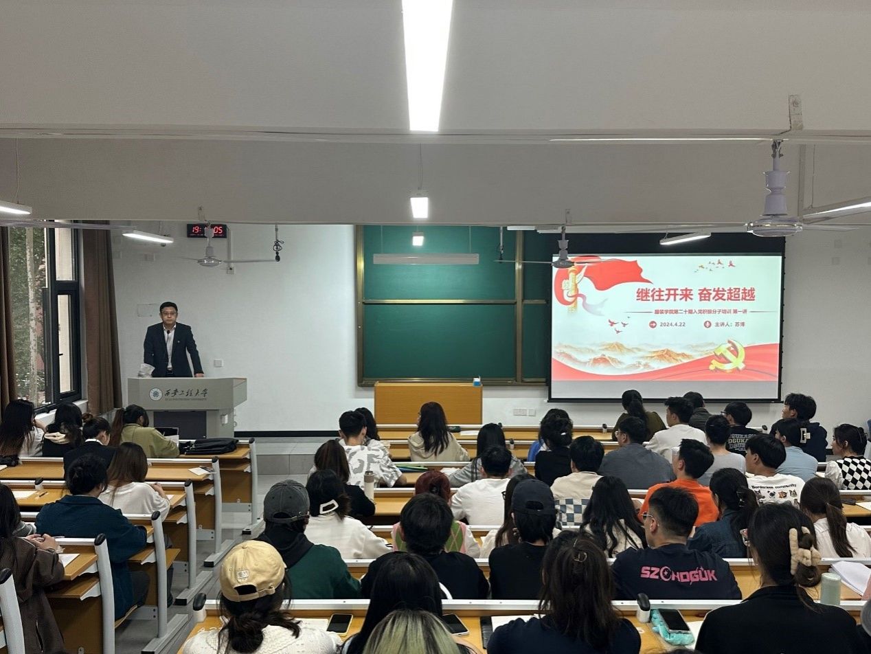第二十期入党积极分子培训班上,院党委书记苏博以《继往开来 奋发超越》为主题作开班第一堂党课。党课从四个方面讲解了党章的总纲部分以及党纪学习教育等内容。4月24日,院党委副书记马磊以“厚植爱国情怀,勇担时代使命”作专题党课讲座,从学习习近平总书记关于高等教育的重要讲话、习近平总书记庆祝建党百年大会上的讲话、习近平总书记党史学习教育动员会上的讲话、习近平总书记来陕考察重要讲话四个方面,引导学生深刻领会习近平总书记重要讲话精神,争做时代优秀青年。4月25日,925足球直播
