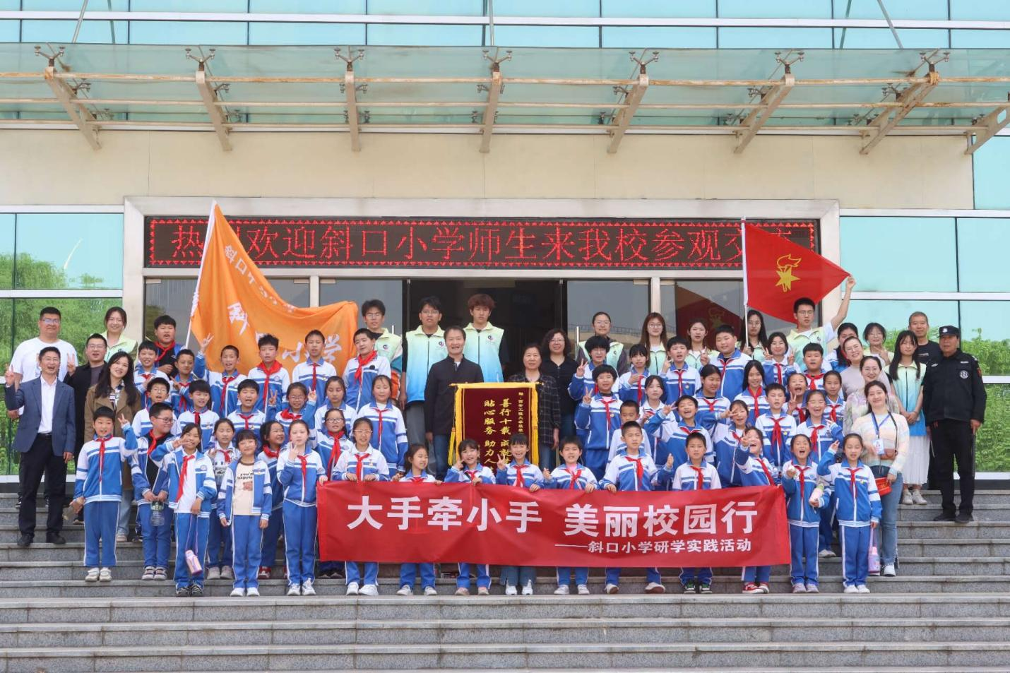临潼斜口小学邓瑞娟、赵丽萍授旗,校团委李梦琦代表我校接旗。今后,双方将继续深化合作,助力青年志愿者们与小学生们双向奔赴,共同成长。