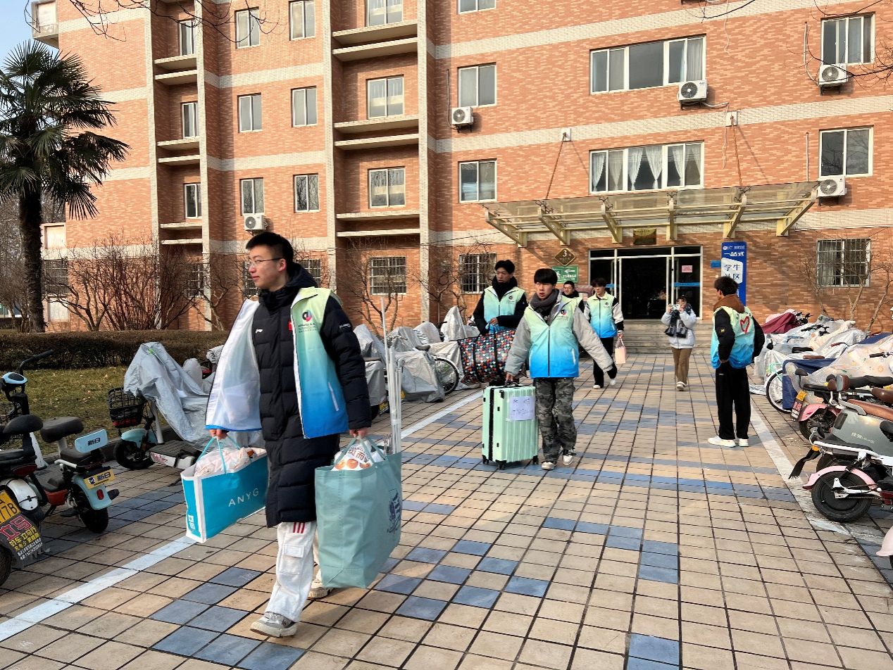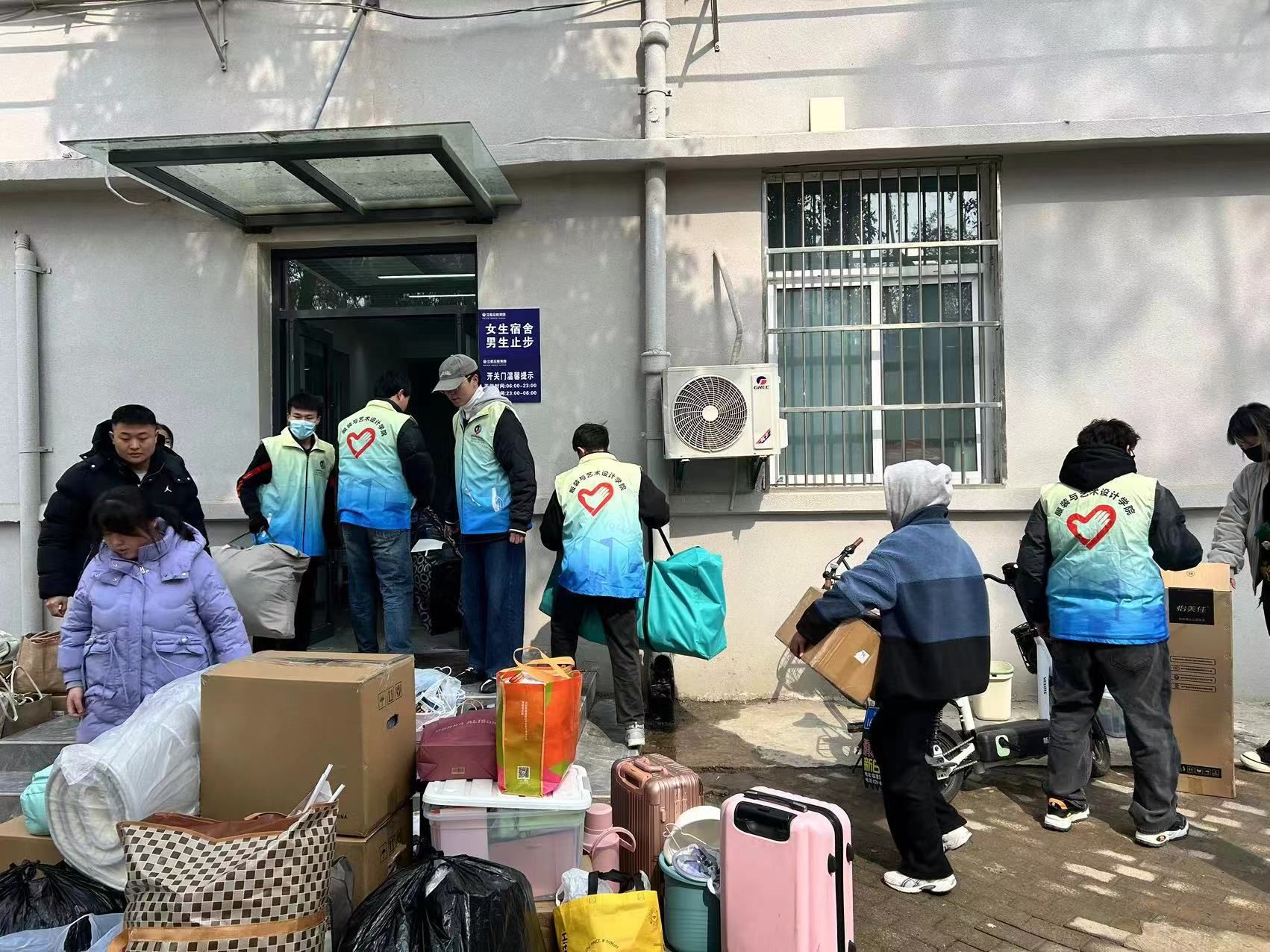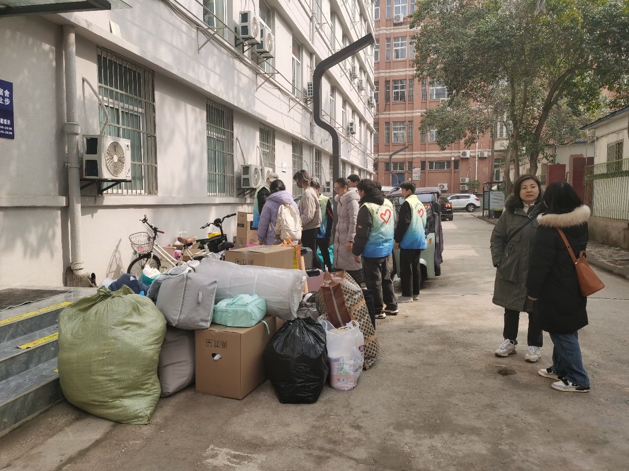 的要求间将各自物品提前打包做好准备。辅导员全面掌握学生情况,结合学生自主搬迁、学校组织搬迁等类型进行沟通协调,反馈相关信息,确保搬迁运力。志愿者不惧严寒驻守点位,细心服务,帮助搬迁同学搬运大件行李,以饱满的热情迎接回迁学生。