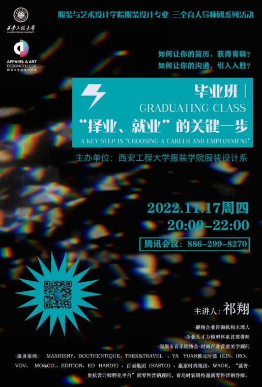 2022年11月17日晚,服装系举行三全育人导师团系列讲座,此次讲座嘉宾祁翔老师带来的讲座题目为:《毕业班/“择业、就业”的关键一步》。讲座由张妍老师主持,服装设计系2019级同学参会。