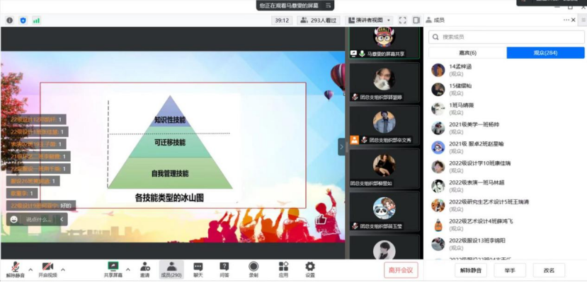 院级培训第一讲,马薏雯老师以《如何成为一名优秀的大学生团员》为主题,向新生团员及团干的大学学习、生活,作出了建议与期望。她通过一幅“冰山图”展示我们所需具备的技能,包括知识性技能、可迁移技能、自我管理技能,明确自身的优点和短板,学会扬长避短,拥有自我认知能力通过自主学习去填补自己的不足。同时,她提出了“吸引力法则”,教学员们如何进行个人的形象管理,听取他人的意见来提高自己的审美能力、如何培养向内的自我认知以及向外的人际关系,由内向外发展。通过“如何抓住机会充分锻炼自己”的问题来告诉我们进入团学组织,作为一名学生干部,我们应该善于思考,具有专注力以及抓重点的能力。