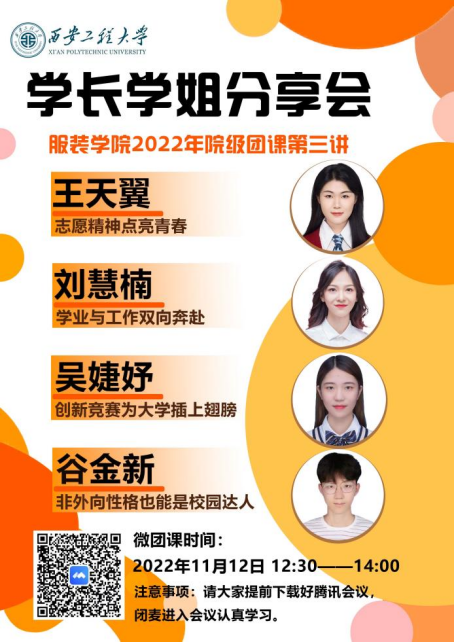 优秀学生代表硕士研究生吴婕妤、研究生支教团成员王天翼、本科2019级团学干部刘慧楠、本科2019级团学干部谷金新通过线上的方式为全体学员进行第三期经验分享《志愿精神点亮青春》、《学业与工作的双向奔赴》、《创新竞赛》、《非外向性格也能成为校园之星》。他们结合自身经历和成长经验从志愿服务、个人发展、工作实践以及创新竞赛方面为我们进行介绍。帮助新生团员和各级团干部解决进入新的学习阶段、工作阶段和未来发展方向面临的难题,其中对竞赛选择、参赛流程的详细介绍让学生对竞赛有了更深刻的理解,选出适合自己参加的竞赛。