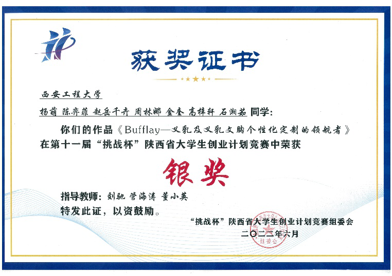 2022年6月18日,第十一届“挑战杯”陕西省大学生创业计划竞赛闭幕式暨颁奖仪式在西安理工大学曲江校区举行。据悉,本次省级竞赛自今年2月份启动以来,吸引了76所高校的10余万大学生、2万余件作品参加校赛。共有889件作品推荐至省赛,经过初评,381件作品进入终审环节。西安工程大学所推选的15件作品中,有11件作品有幸入围终审答辩,经过层层角逐、激烈竞争,最终荣获金奖1项、银奖3项、铜奖7项,同庆,我校也荣获了大赛“优秀组织单位”荣誉称号。
