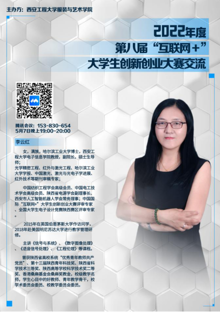 2022年5月7日晚19:00-20:30,袁燕副院长组织师生通过线上方式参加了第八届“互联网+”大学生创新创业大赛交流学习会,会议特别邀请了西安工程大学电子信息925足球直播