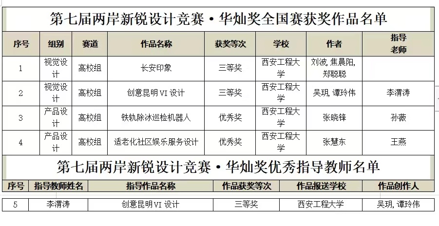 17级产品设计专业学生刘波、焦晨阳、郑聪聪的《长安印象》作品获视觉组三等奖;视觉传达设计专业学生吴玥、谭玲伟的作品《创意昆明VI设计》(指导教师:李渭涛)获视觉组三等奖;工业设计专业学生张晓锋《铁轨除冰巡检机器人》作品(指导教师:孙薇)获产品设计组优秀奖;产品设计专业张慧东作品《适老化社区娱乐服务设计》(指导教师:王燕)获产品设计组优秀奖;李渭涛老师获优秀指导教师奖,为我校获得荣誉。