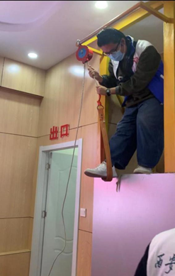 (同学们体验绳索逃生并进行消防员出险换装比赛)