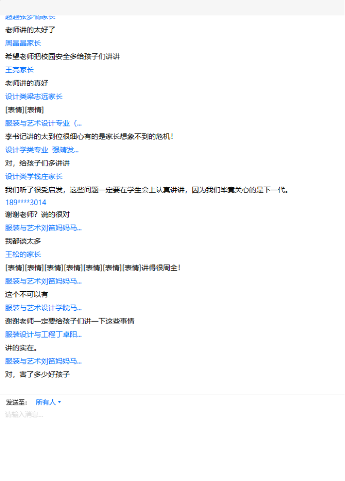 李筱胜结合多年从事教育管理服务的经验,以“安全与学业”为主题,分别从交通安全,心理健康,不良习惯列举出大学生容易遭受的伤害,又从家庭,学校,社会等方面影响学生学业的因素,向家长和同学们提出多点建议,希望家长们加强与学生的有效沟通,教育孩子遵守法律法规与校纪,规范孩子的生活习惯,避免家庭因素对孩子的影响。李筱胜的发言得到与会家长一致认同,家长纷纷留言表示李书记发言中肯、语言实在,有很大收获,并表示支持与感谢。