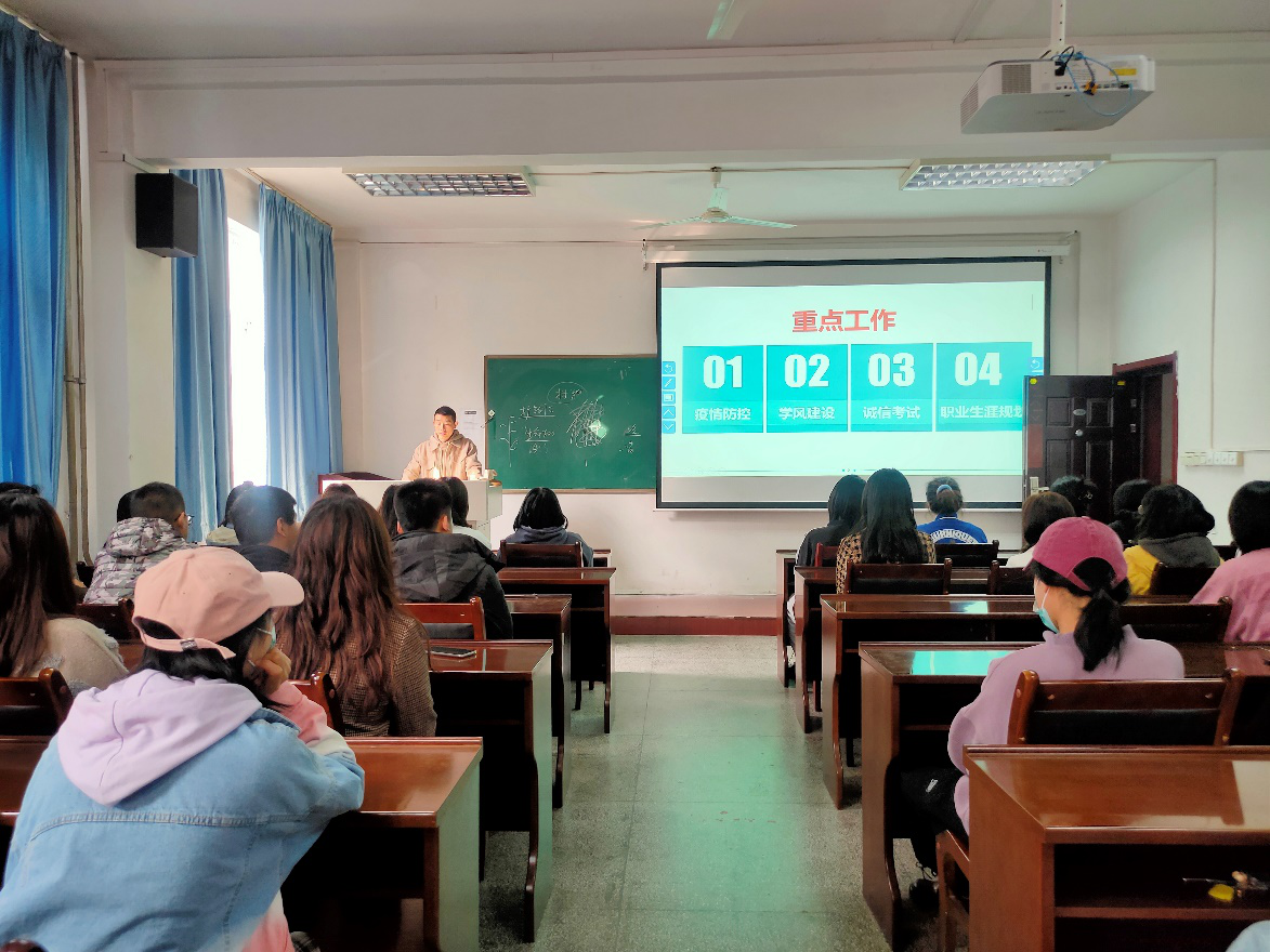 在大会中,辅导员根据学校近期的重点工作安排,分别从疫情防控、学风建设、诚信考试以及职业生涯规划等四个方面对全体学生做出了明确的要求,特别强调全体同学要严格遵守学校的疫情防控相关规定,坚持每日晨午检测温,外出请假和报备制度,并坚决做好个人防护,巩固好来之不易的疫情防控成果。最后,两位辅导员要求全体学生以饱满的精神风貌开始新学期的学习和生活,守好学习本分,把握学习主业,加强能力提升,以优异的学习成绩为建党100周年献礼。