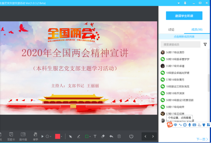 本科生服艺党支部于6月17日晚20点,通过腾讯课堂平台召开线上全体党员大会,专题学习“两会”相关文件及会议精神。本次专题学习活动由服艺党支部书记王丽丽老师主持。
