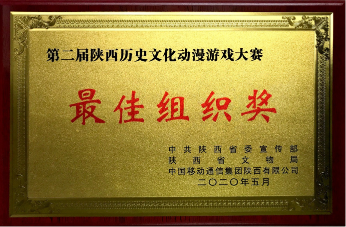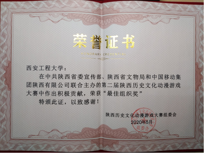 近日, “第二届陕西历史文化动漫游戏大赛”颁奖仪式在铜川博物馆举行,西安工程大学获得大赛组委会颁发最佳组织奖。