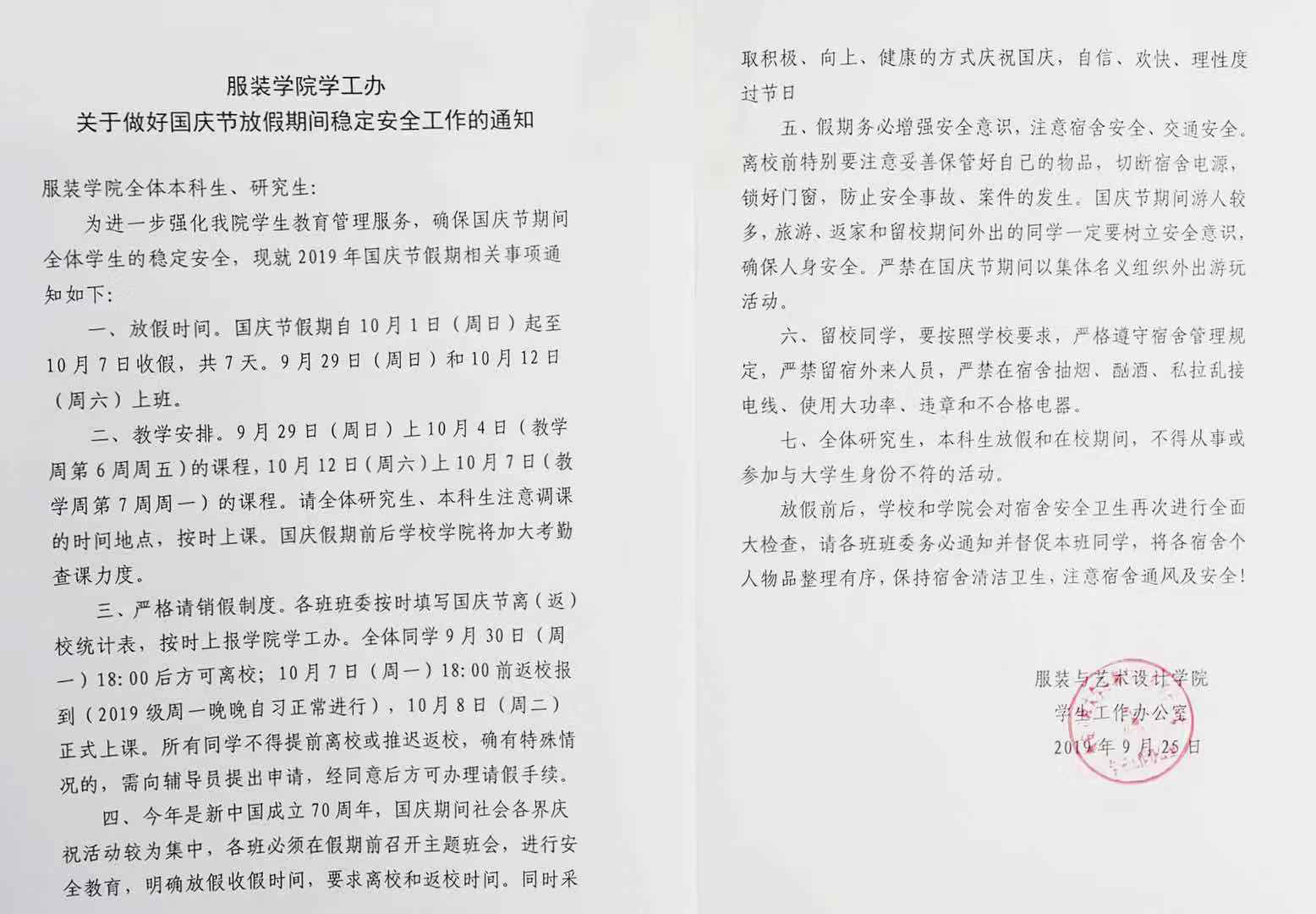 二是重视学业发展,与时代同奋进、共命运。国庆放假前学校会严查上课情况,严禁出现旷课、找人代课等现象,不允许提前离校。