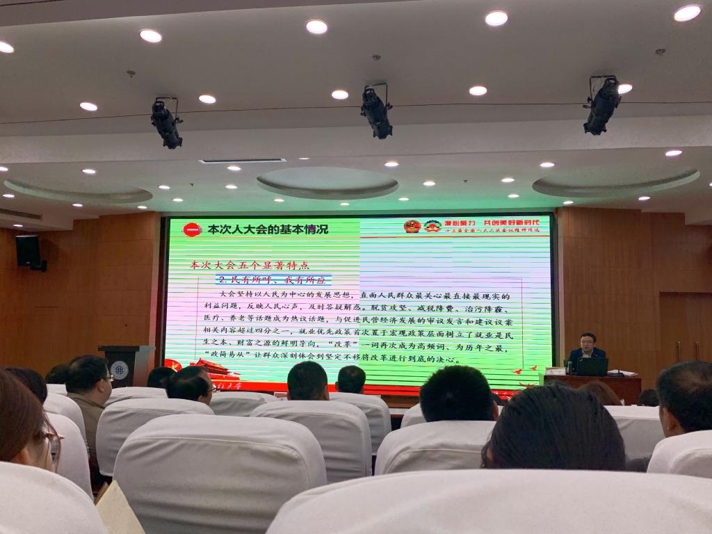 的师生代表在临潼校区图书馆一层报告厅积极参加并认真听取了高岭校长进行的两会精神传达,他作为十三届全国人大代表、省委“代表委员讲两会”宣讲团成员,用深入浅出的语言,详略得当地全面介绍了两会的台前幕后,加强师生对两会的背景与效果的理解掌握。