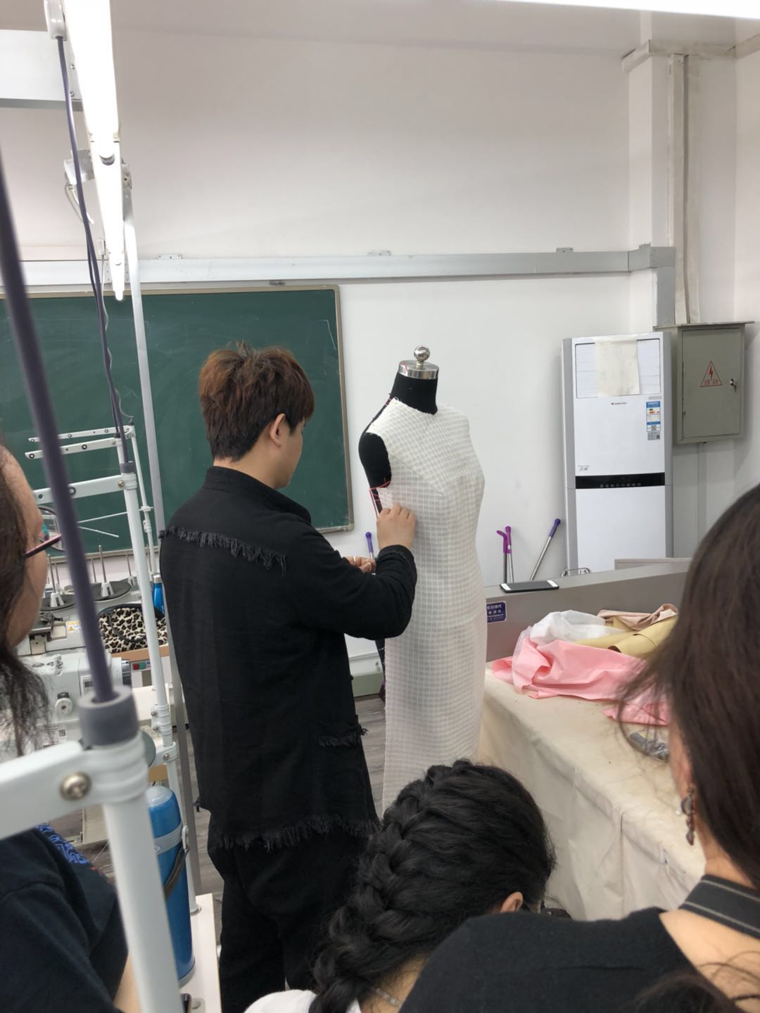 第二天上午的课程主要是对面料进行处理,根据纸样裁剪出衣片;下午在主楼723教室进行《婚纱礼服流行趋势、品牌理念及发展》的专题讲座。本次讲座还邀请到GraceyHan手工坊韩老师就《法式刺绣工艺制作》进行联合讲座。在讲座中,朱老师就2017年《莲御》品牌在北京服装周上的品牌服装发布进行分享,以及品牌目前发展现状与同学们做以交流。韩老师就法式刺绣的工艺制作进行现场展示,为同学展示出自己作品并进行了详细的讲解。