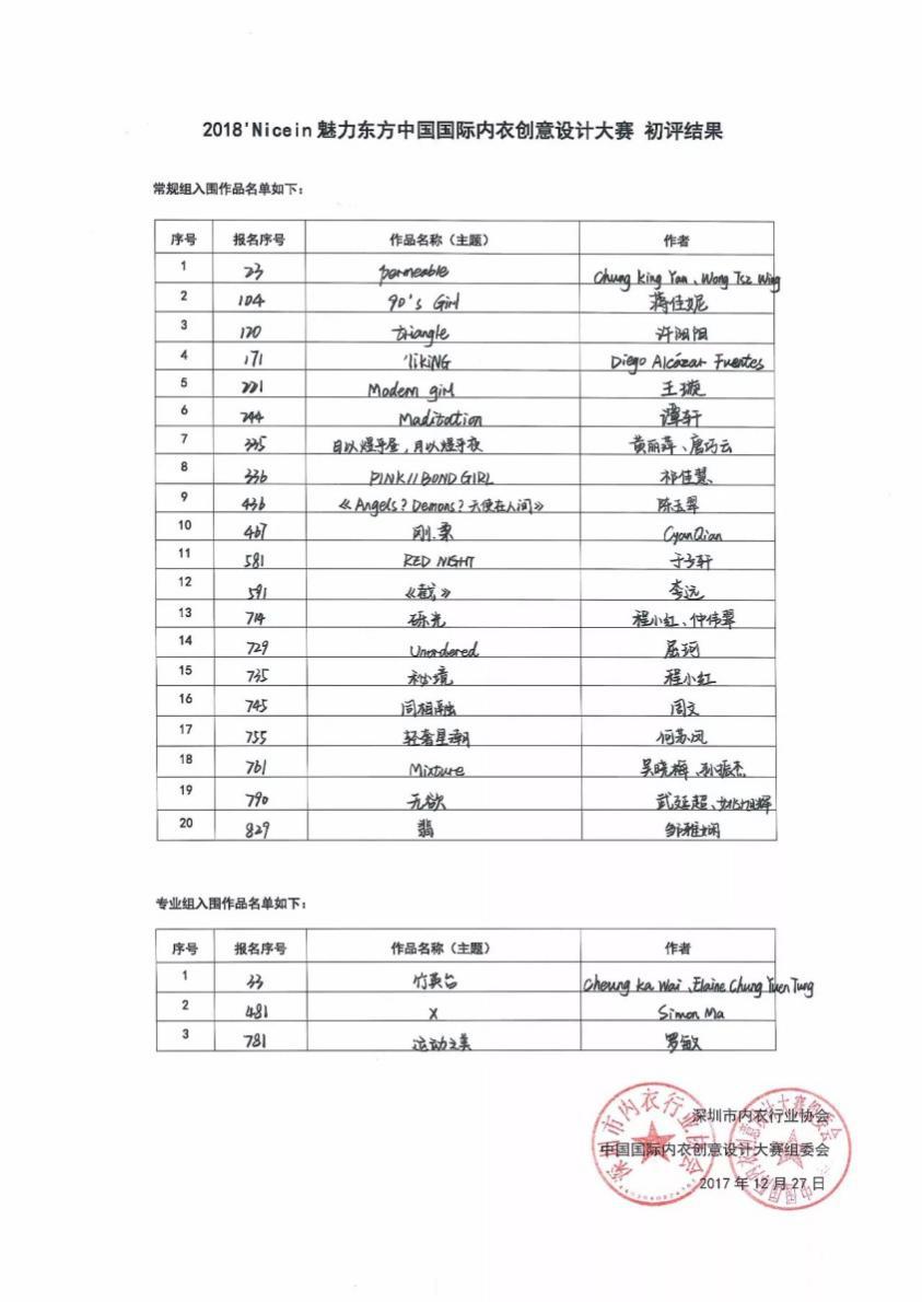 2017年12月27日,2018’Nice in魅力东方中国国际内衣创意设计大赛初评在深圳市光明新区会展中心圆满举行。经过专家评审团以“公平、公正、公开”的原则进行层层筛选,20副常规组作品及3副专业组作品最终脱颖而出,入围2018年4月的总决赛。西安工程大学925足球直播