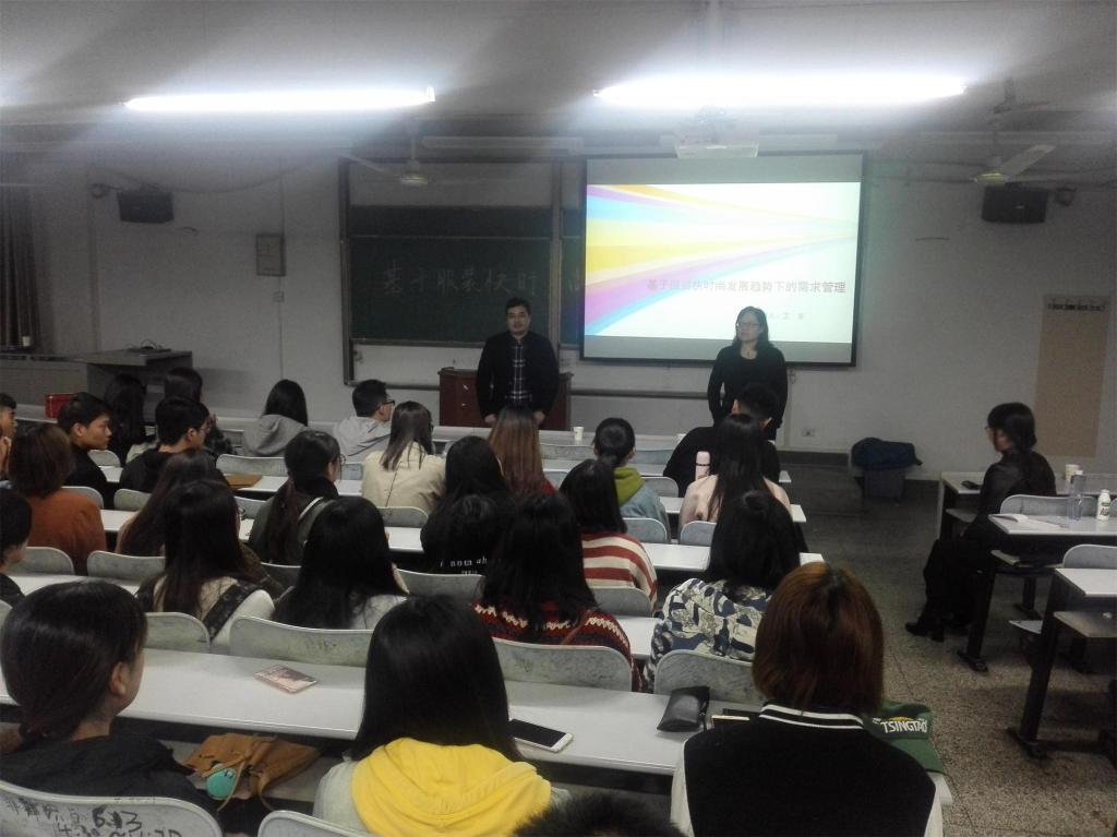 王吉副总经理以基于服装快时尚发展趋势下的客户需求管理为主线,从管理的角度为同学们进行了精彩的演讲。对于“快时尚”的含义、需求管理、需求管理的重要性、如何进行需求管理等四个方面分别进行了详细的介绍。同学们积极提出了自己在学习过程中的疑问,王吉先生对同学们的疑问做出了仔细又专业的解答,使大家受益匪浅。