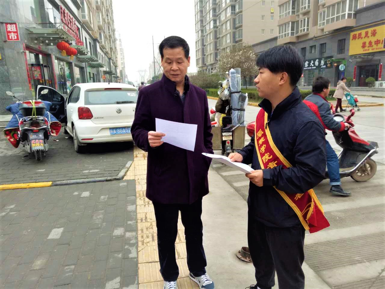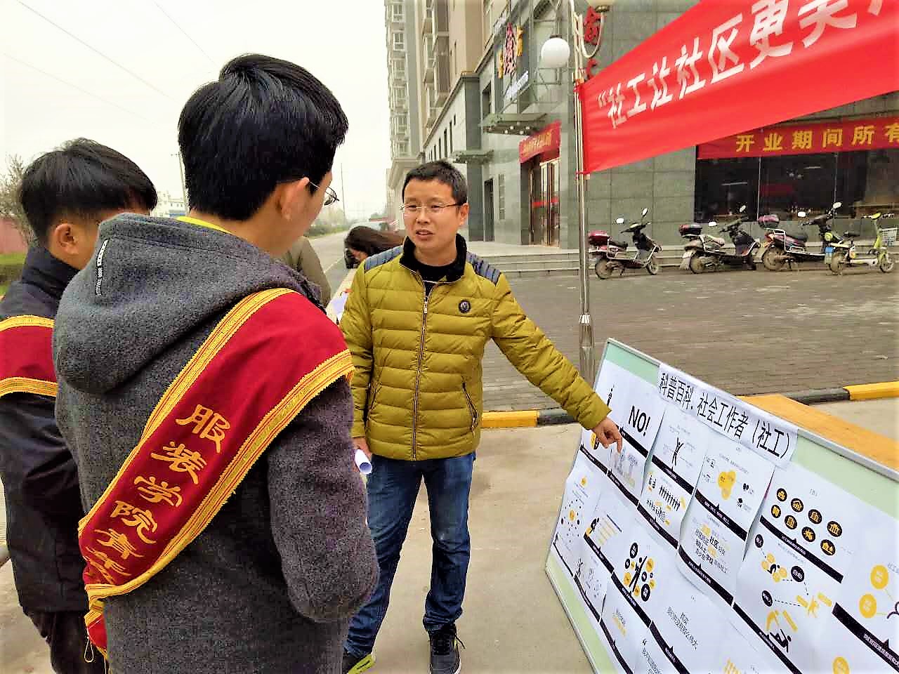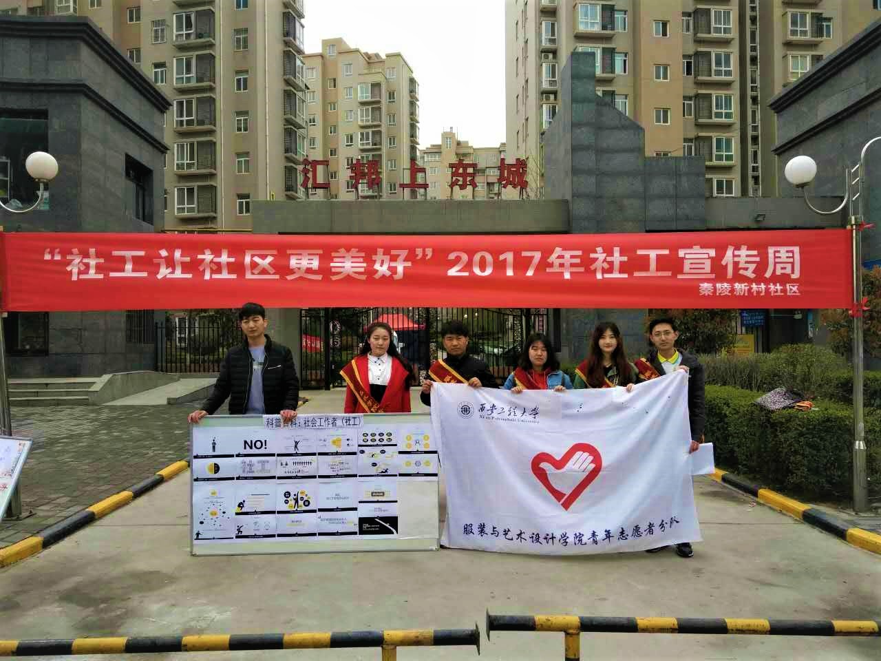 为更好的弘扬社会工作精神,传播社会工作知识,提高大学生志愿服务。服装与艺术设计学院志愿者于2017年3月24日早上九点在临潼区汇邦上东城小区门口进行“让社区更美好”世界社会工作日的宣传活动。