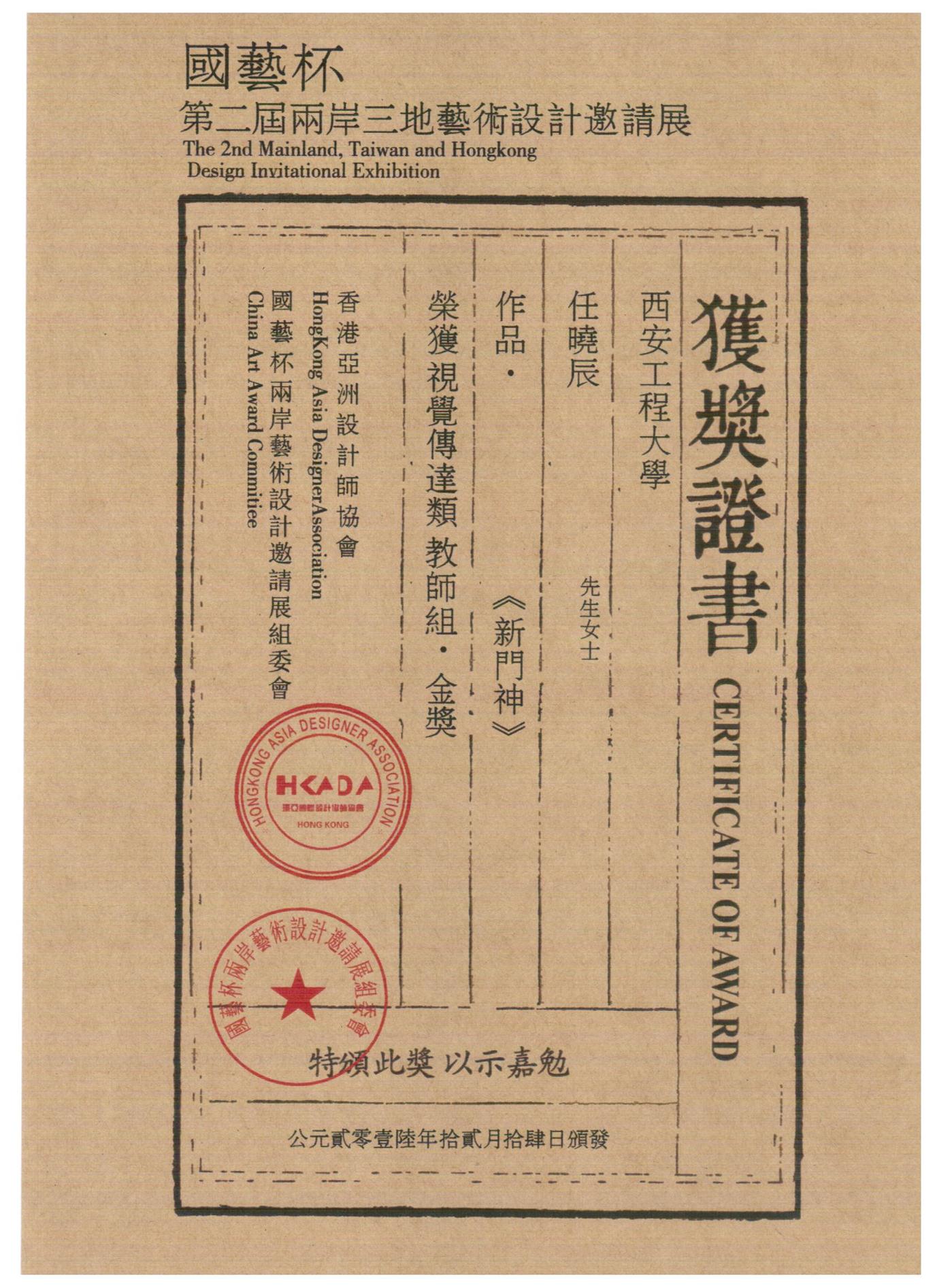 青年教师任晓辰携参赛作品《新门神》和《空间导向共生》参加了第二届“国艺杯”两岸艺术设计邀请展,并最终两项作品分别获得专业组金奖,同时作品《新门神》还入围2016靳埭强设计奖比赛专业组。