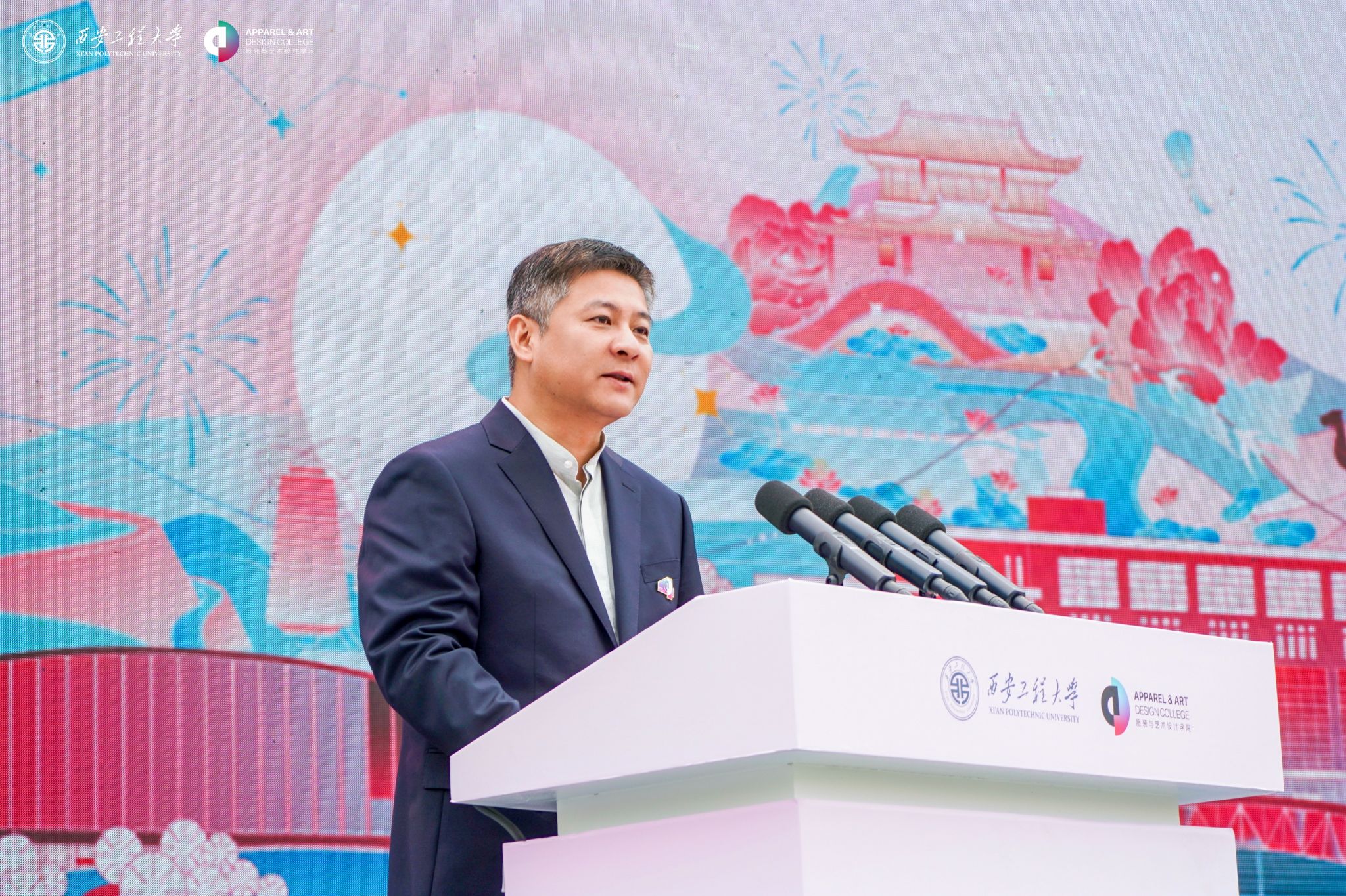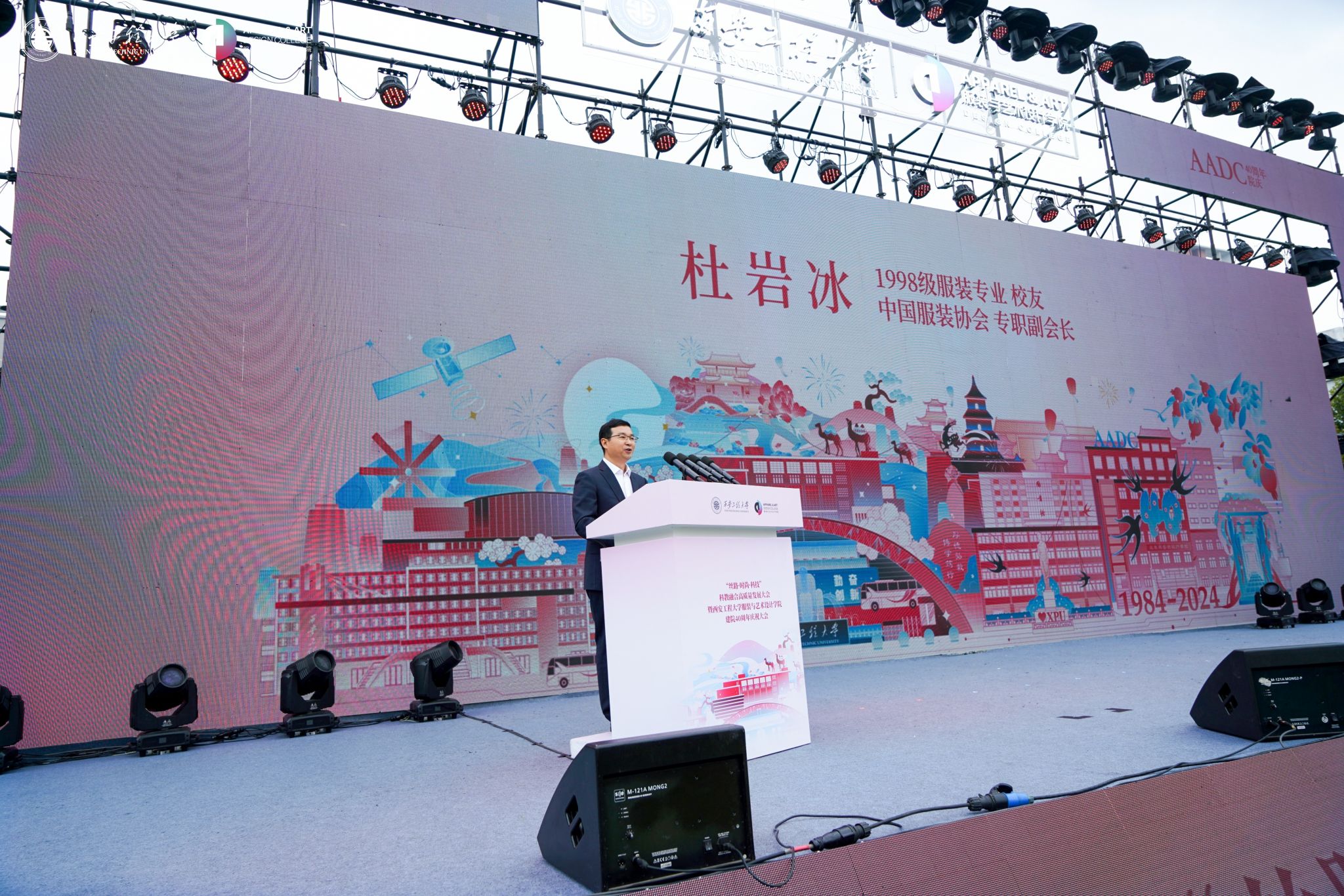 创建及发展的奋斗岁月;校友代表、中国服装协会副会长杜岩冰表达了对母校的感恩和祝福;教师代表王教庆副教授在发言中表示将继续用爱履行责任,用心躬耕教坛潜心育人;学生代表、2022级研究生郎雨欣分享了成长与收获。
