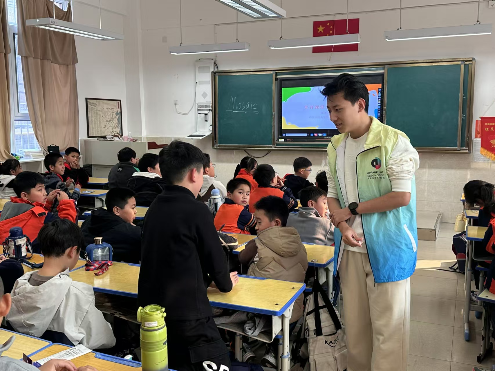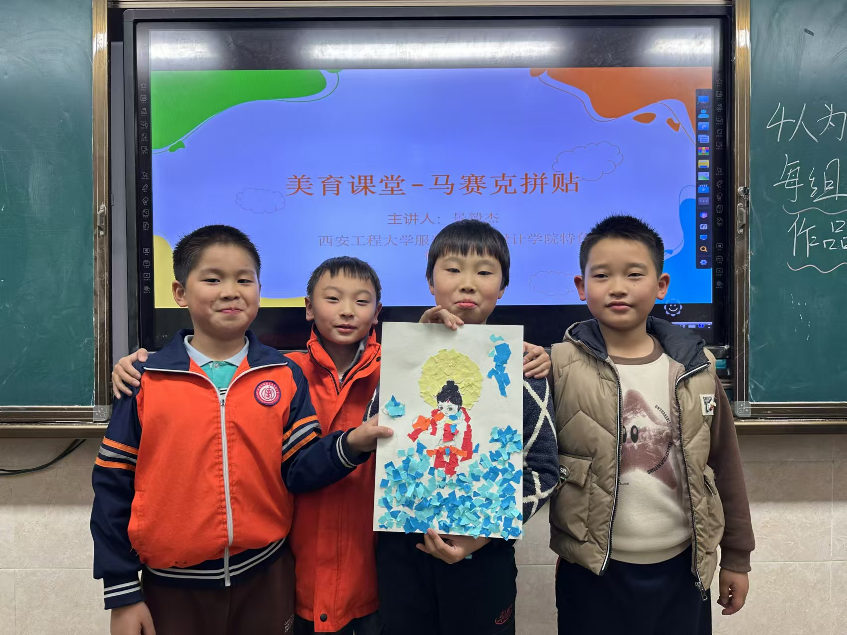 课程最后的展评阶段,每位小学生都上台展示了自己的作品,并分享创作过程中的心得与体会。同时,志愿者们还通过提问的方式引导学生们更加深入地观察与感受作品,这不仅增加了课堂的互动性,还进一步增强了学生对马赛克拼贴艺术的理解与创作能力。