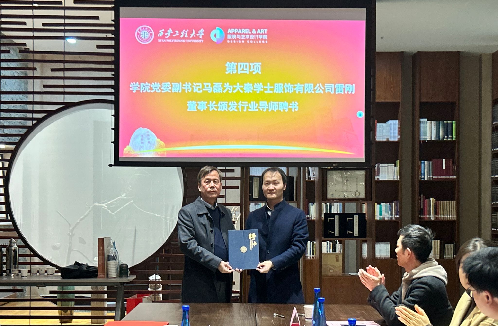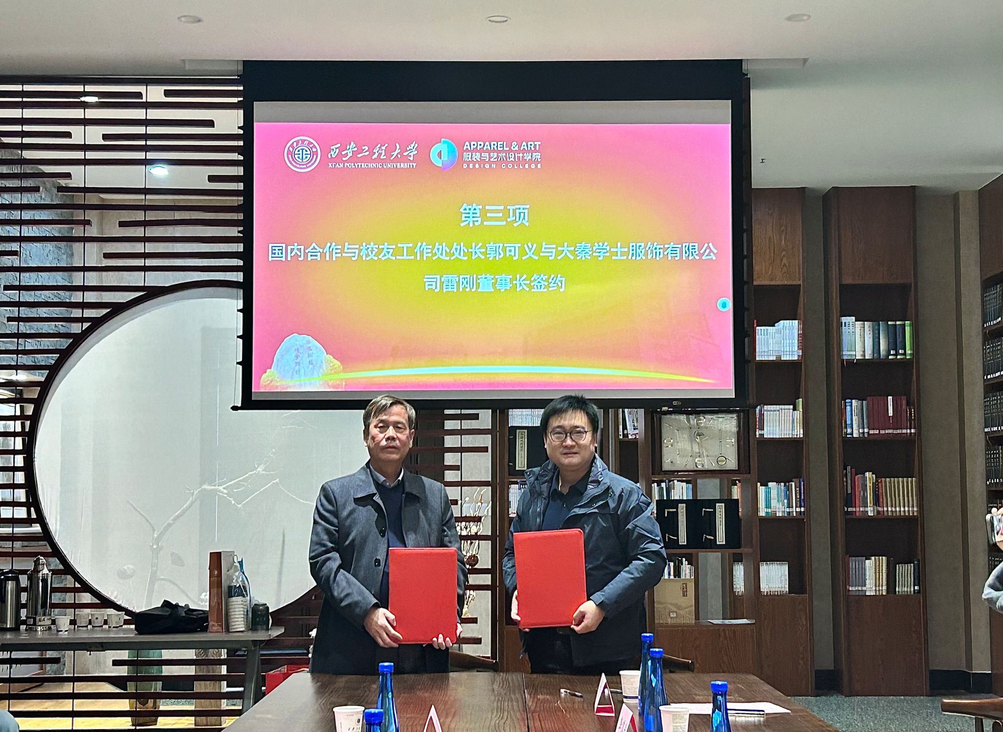 签约仪式上,郭可义对陕西大秦学士服饰有限公司表示热烈欢迎,并与雷刚就校企合作模式进行深入交流,高度赞扬了企业长期以来对学校发展的关注与支持,特别是对学生成长的深切关怀。他强调,这种校企合作模式不仅为学生提供了更多的实践机会和奖学支持,也为学校的教学科研注入了新的活力。随后,郭可义代表学校教育发展基金会与雷刚签订了“大秦学士奖学金、奖教金”协议,并与雷刚就双方未来的合作模式进行了深入而细致的交流,双方均表达了对未来合作的美好期待。