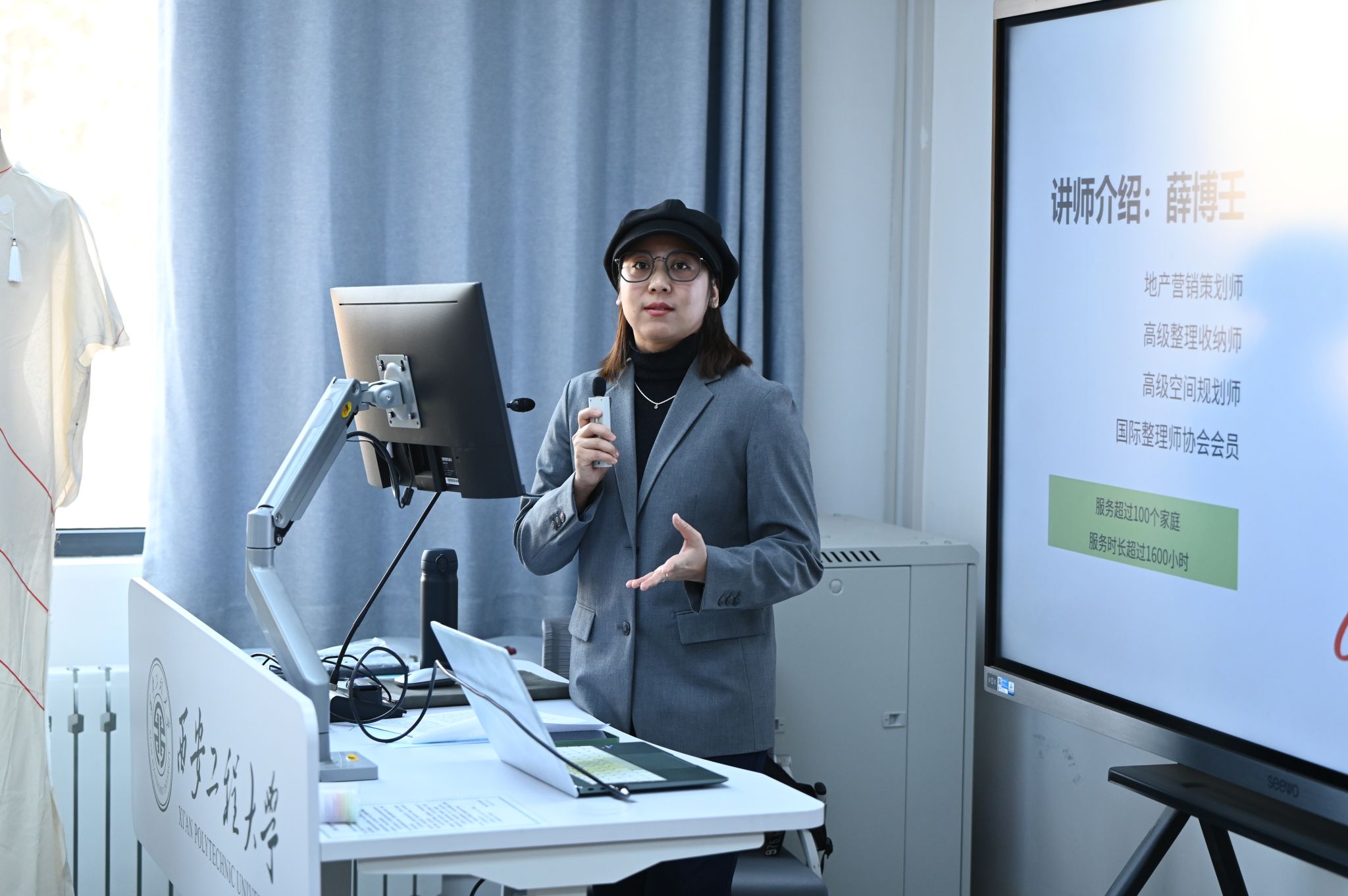 现场,专业整理收纳师还原真实场景,演示衣物整理技巧。收纳师分享“用空间控物品、控购买欲”的理念,启发同学们重新思考收纳与消费的关系。老师们还讲述断舍离的历史演变,推荐相关书籍与人物,拓宽同学们对收纳文化内涵的认知。整理收纳师薛博壬老师提到:“整理收纳要契合个人习惯,为不同需求定制方案”。