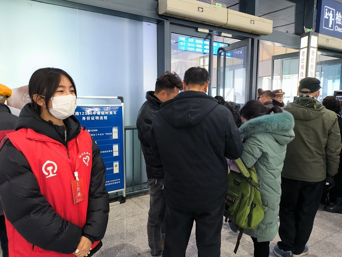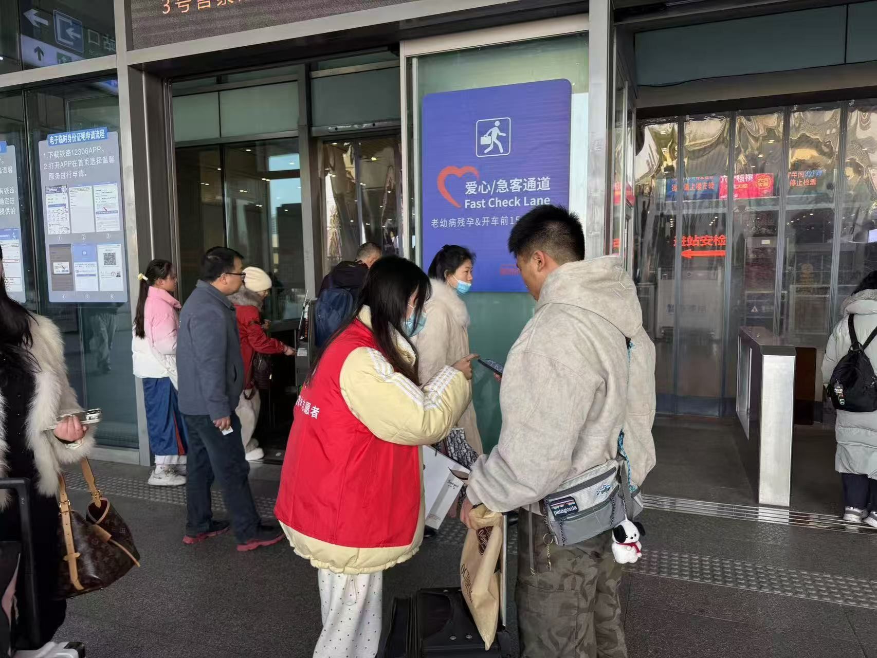 各地在活动开展前均对志愿者进行了专业培训,内容涵盖春运客流引导、应急救护、重点旅客帮扶等。活动启动后,志愿者们奔赴各站点,在安检口、候车厅、售票处等区域,为旅客提供引导咨询、秩序维护、行李搬运等便民服务。24级设计学类16班龙甜甜、24级设计12班张语娜负责指引工作,化身“活地图”,为旅客提供准确的指引,确保旅客能够快速找到进站口、售票厅、卫生间等关键地点。针对特殊群体,志愿者们开通“绿色通道”,一对一协助购票、进站。