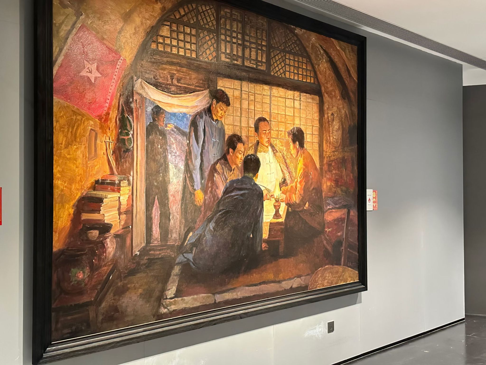造型艺术系副教授、硕士生导师张蓓创作,是其深耕红色题材的第八幅力作。作品以1924年陕北创建第一个党组织为历史内核,采用室内外联动构图,生动刻画了李子洲、王懋廷、田伯英等先驱围坐研讨的激情瞬间。画面通过油灯、党旗等细节,不仅还原了历史场景的严谨性,更寓意着革命的星火燎原,兼具极高的艺术感染力。