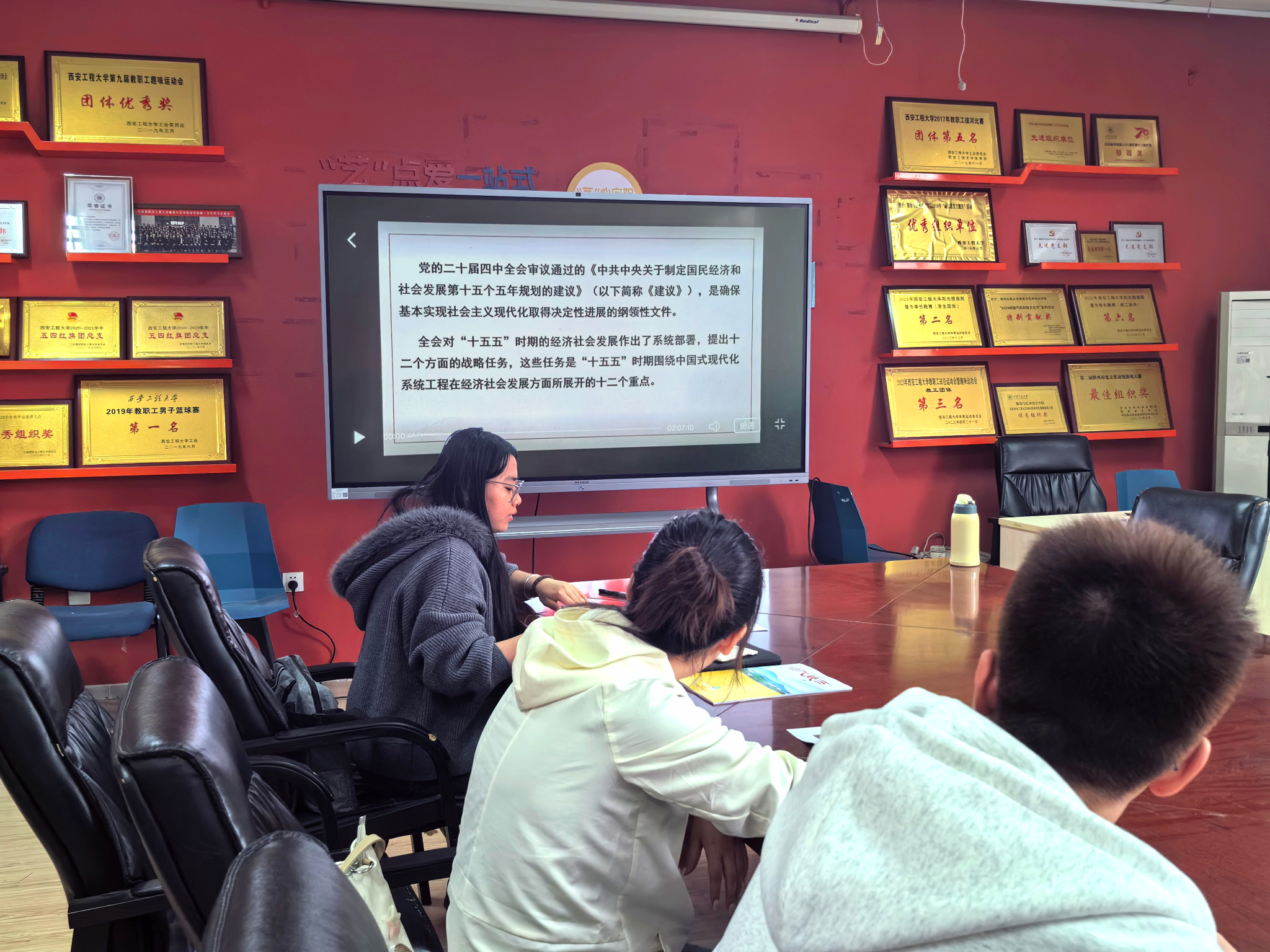 党团活动室进行集体学习,深入学习贯彻党的二十届四中全会精神。支部书记马薏雯老师参会指导,支部全体党员参加。会上,马薏雯首先作学习动员,要求全体学生党员深刻领会“十五五”时期经济社会发展的指导思想、重大战略任务,切实增强责任感和使命感。