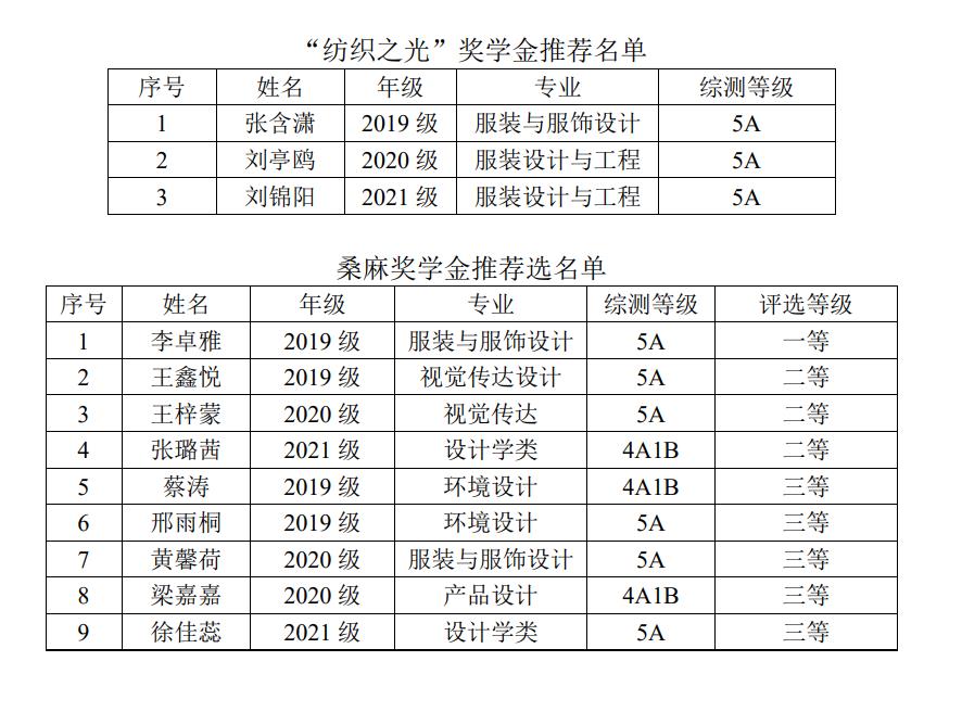 根据西安工程大学《关于做好2021-2022学年“纺织之光”学生奖和桑麻奖学金评审工作的通知》的评选要求,经学生申请、年级推荐,925足球直播 学生资助工作领导小组审议,925足球直播 党政联席会通过,现将925足球直播 2022年纺织之光、桑麻奖学金推荐名单进行公示。公示时间为2022年9月20日18:00至9月23日18:00。如有异议,请于公示期内向所在年级辅导员反映。