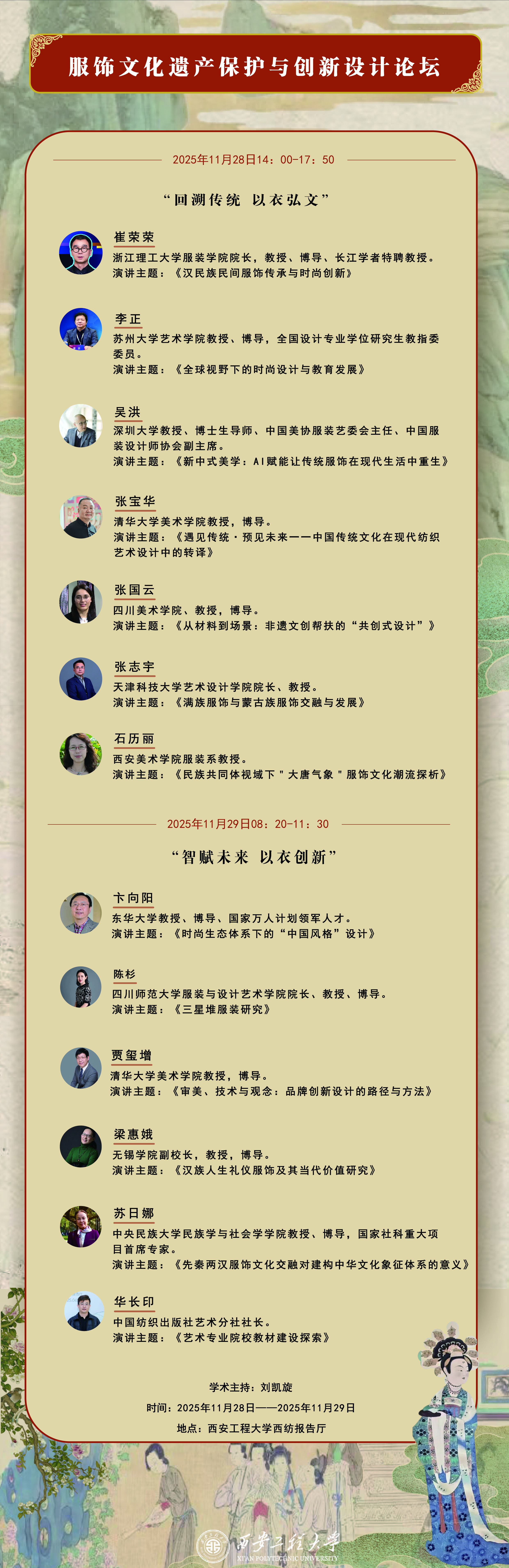 925足球直播 将于11月28-29日举办《服饰文化遗产保护与创新设计论坛》,邀请了13位国内服饰文化领域最知名的专家。欢迎校内外师生来我校学习交流(不收任何费用,食宿、差旅自理)。