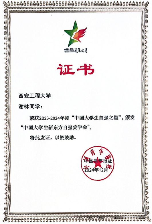 谢林以优异的综合表现,先后荣获陕西省 “大学生自强之星” 称号、西安工程大学 “优秀学生标兵”“优秀毕业生干部” “五星级志愿者”“优秀团干部”“优秀学生”“优秀运动员”“最佳辩手”等荣誉。