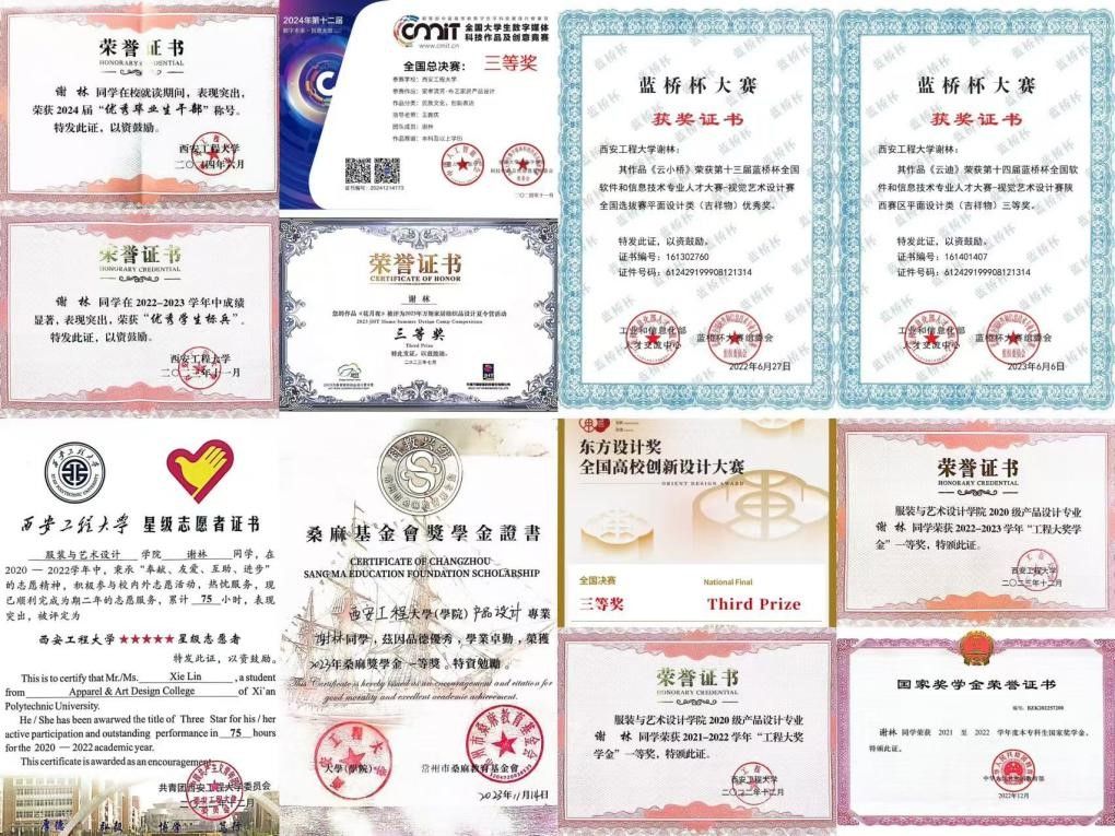 同时在各类专业竞赛中,他也屡获佳绩,获蓝桥杯第 14 届视觉艺术设计赛陕西赛区平面设计三等奖;第 11 届未来设计师全国高校数字艺术设计大赛陕西赛区一等奖;