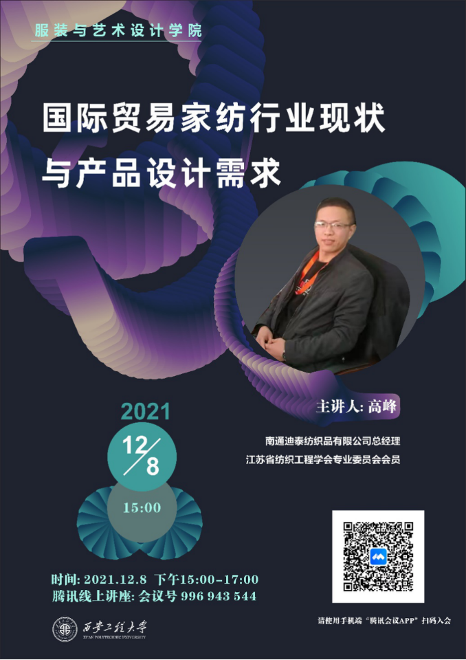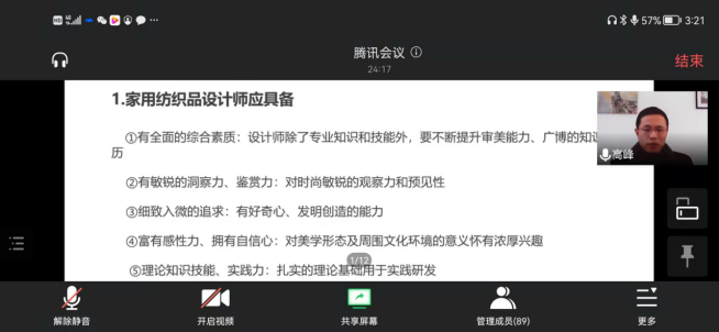 产品设计系于12月8号15:00在腾讯会议召开产品设计专业导师团活动。此活动特邀我校优秀校友、南通迪泰纺织品有限公司总经理、江苏省纺织工程学会专业委员会会员高峰老师为产品设计专业全体师生进行《国际贸易家纺行业现状与产品设计需求》的主题讲座,会议由产品设计系王燕老师主持,产品设计系教师及本科生九十余人参加会议。