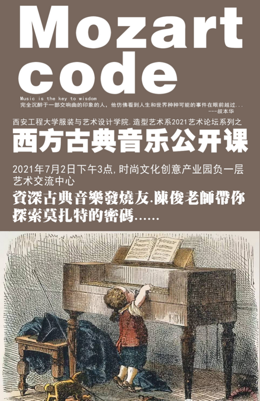 陈俊老师以莫扎特音乐为主题为同学们解析西方古典音乐的基础常识,以现场聆听讲解的方式探讨音乐与绘画、设计、认知等层面的关系和助益。公开课现场,扣人心弦的音乐伴随着绘画、设计的思维碰撞,通过这种形式开拓同学的艺术视野,提高艺术素养,最终为本专业的发展提升提供丰富的艺术营养。