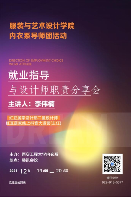 内衣工程系于12月6日在腾讯会议召开内衣工程专业就业指导与设计师职责导师团分享会。此次会议特邀我校优秀毕业生红豆居家设计部主任李伟楠主讲,会议由内衣系主任周捷教授主持,内衣系教师及全体内衣系本科生一百余人参加会议。