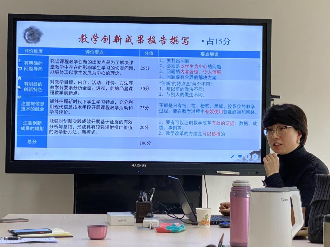 任燕老师主要围绕课堂教学创新大赛进行解读,同时还针对参赛材料准备的关键点、参赛内容延伸以及不同专业的课程设计等几部分内容进行阐释。从高校课堂教学创新大赛的来源和宗旨,本届课堂创新大赛的侧重点的变化,再到教学成果报告的撰写要点和评价维度,以及课程实录视频的制作要求,进行了深入的分析和解读。参会教师认真听取经验,热情参与讨论,针对本专业的教学改革和本次参赛的课程设计提出了许多具体的问题,并和任燕老师沟通了改进的思路。