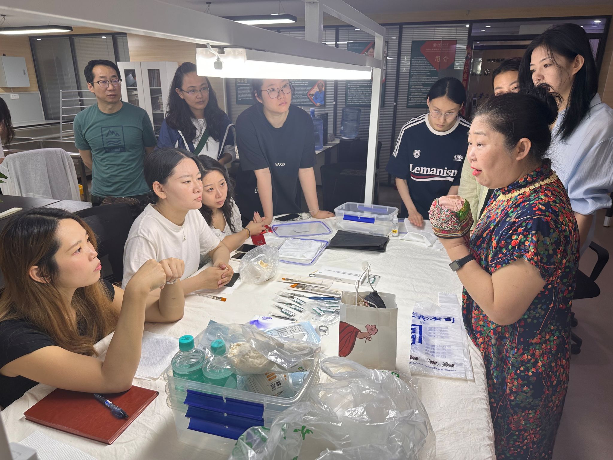 本次培训内容围绕纺织文物品的清洁、整形、修复、分析开展学习,以理论授课和实操教学相结合的方式进行,同时针对师生日常科研中遇到的问题进行交流探讨。参培学员通过本次学习,提升了科研能力,理清了纺织品保护与修复思路,为传统服饰研究与设计创新提供了有力支撑。