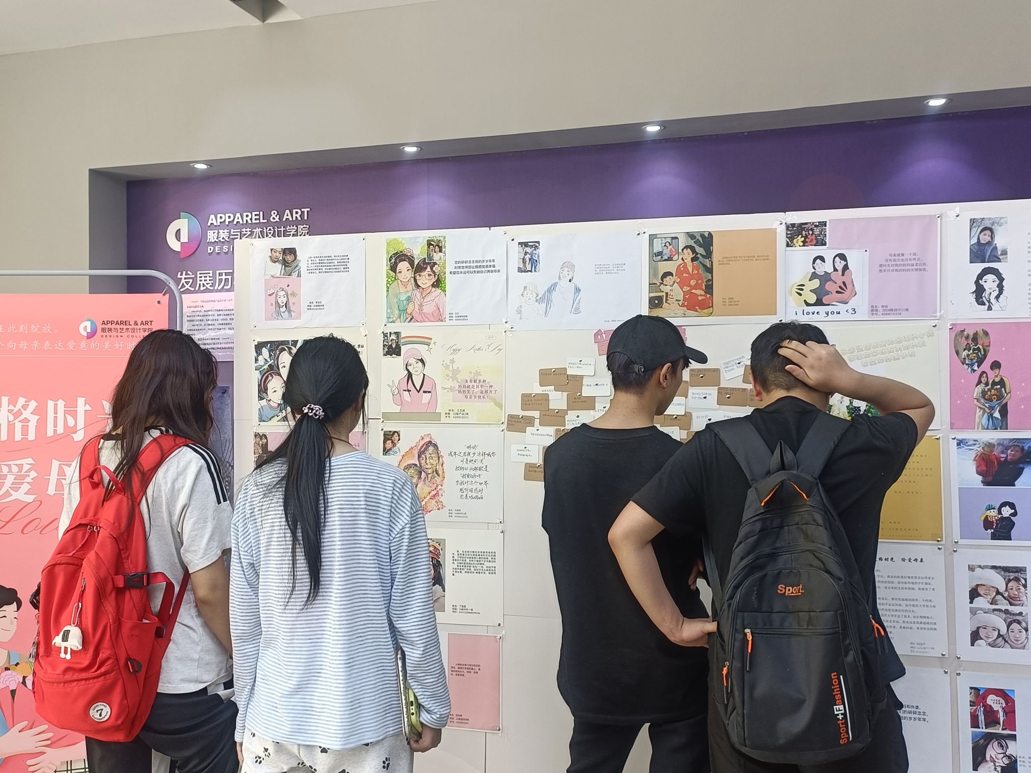 活动现场还特别设置了“爱的留言墙”,吸引众多同学们驻足书写祝福。一句句“妈妈,我爱您”“愿时光慢行,您永远年轻”的真挚话语,与展出的艺术作品交相辉映,凝聚成感恩的暖流。