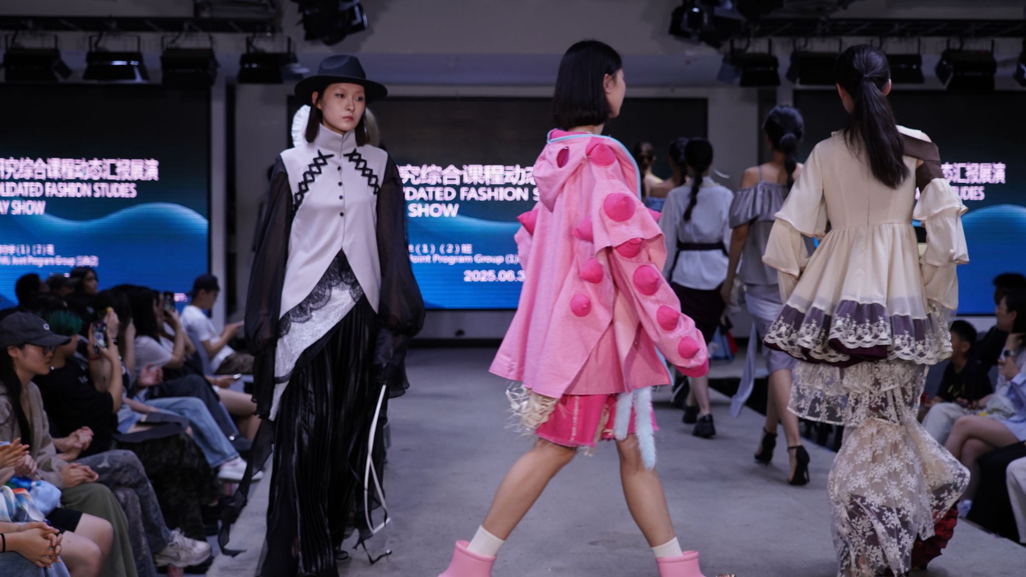 本次展演系列策划、背景音乐编选、定妆照拍摄及化妆造型等环节全程由2023级中英班学生独立完成。课程以深化设计师风格研究为核心,通过系统训练培养学生对作品的解构重组能力与功能性细节创新思维。学生在规定主题框架下,基于独立调研与团队协作完成成衣系列设计。作品既精准捕捉国际时尚前沿动态,又融入个性化创新解读,彰显了跨文化教育背景下的独特审美视野、专业素养与实践精神。
